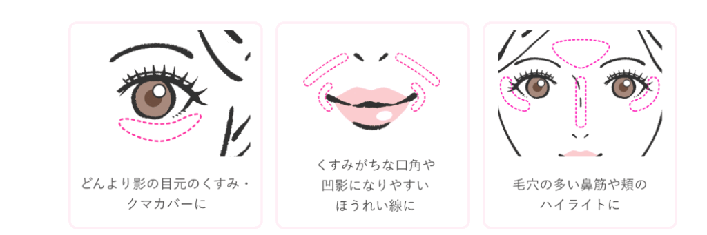 くすみが気になる部分や、明るさを出したい部分に塗布します。